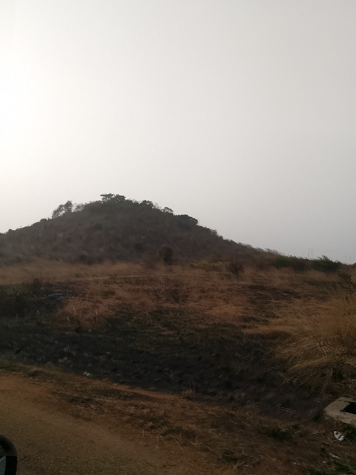 The image displays an arid outdoor environment in Dorowa, Nigeria, under a hazy, light grey sky. A large, rounded hill dominates the background, its summit featuring dense dark green foliage, while its slopes are covered in sparse, dry brown vegetation. The foreground comprises a sloped terrain primarily covered by light brown, dry grasses. A significant, irregular patch of blackened earth, indicating a past fire, extends across the mid-ground. A lighter brown dirt path or track traverses the extreme lower foreground. In the lower right corner, a partial view of a square concrete drainage or sump structure is visible, with some white debris nearby. A dark, curved object, consistent with a vehicle's interior component, is partially visible in the lower left corner. No individuals or specific actions are depicted.