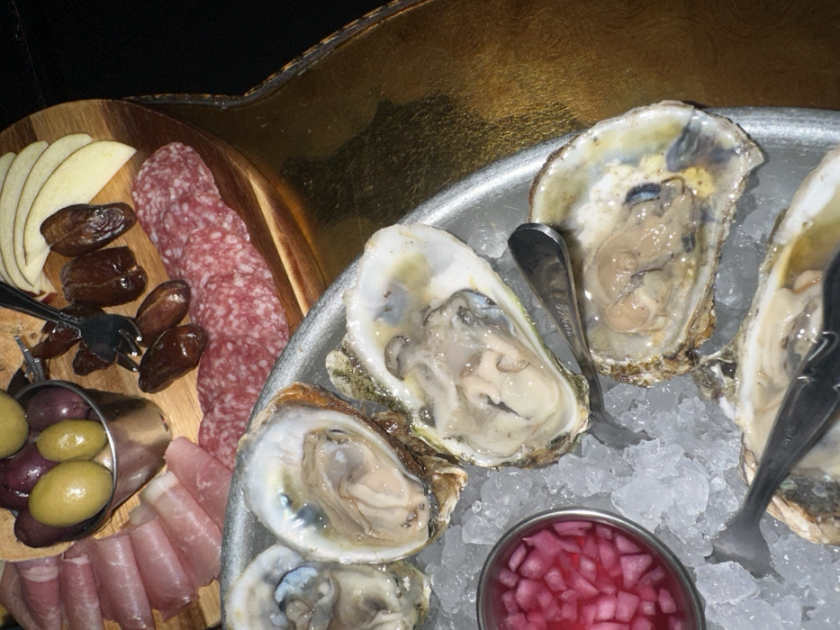 plate of oysters on ice with a side of pickled onions. There are four oysters, all open and ready to be eaten. Two silver oyster forks are present. The oysters are on a silver platter with a gold-toned background. The plate is located next to a wooden cutting board with an assortment of cured meats and dates. There are sliced apples and olives on the cutting board, which also sits on a gold-toned table. The image was taken in the city of New York, United States, at the location specified by the coordinates. The specific location within the city cannot be determined from the image.