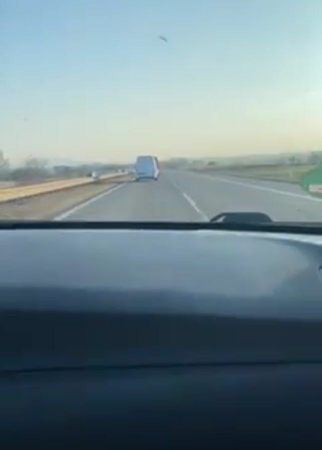 view from the dashboard of a car driving on a highway. A white van is visible in the distance, driving in the same direction. Other cars are also visible on the road. The sky is blue and clear. The landscape beside the highway is mostly flat with some vegetation. The dashboard is dark grey and has a textured pattern. A round green sticker is visible on the windshield.