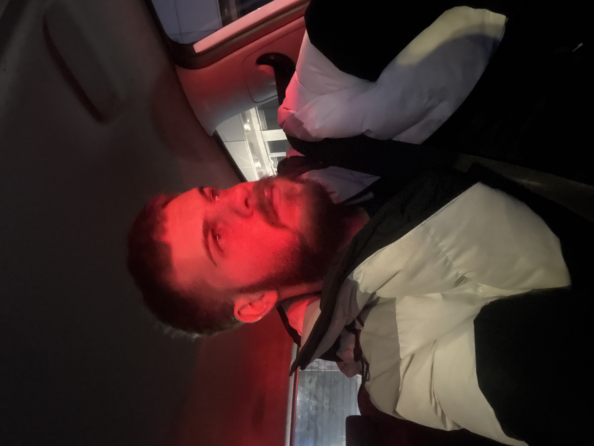 A man with a beard is inside a vehicle, possibly a car, with his head resting on a white pillow
