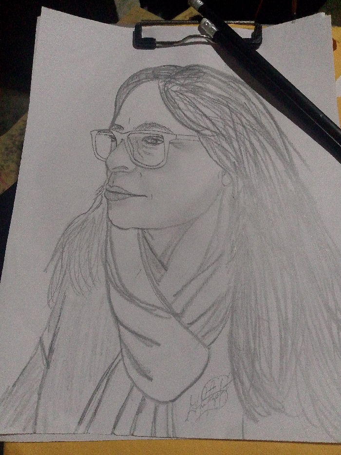 A grayscale sketch depicts a woman wearing glasses and a scarf. She is drawn in profile, facing left. Her hair is long and flows around her face and shoulders. The drawing is on a piece of paper attached to a clipboard, with two pencils resting on top. A signature is visible in the bottom right corner. The shading suggests a soft light source.