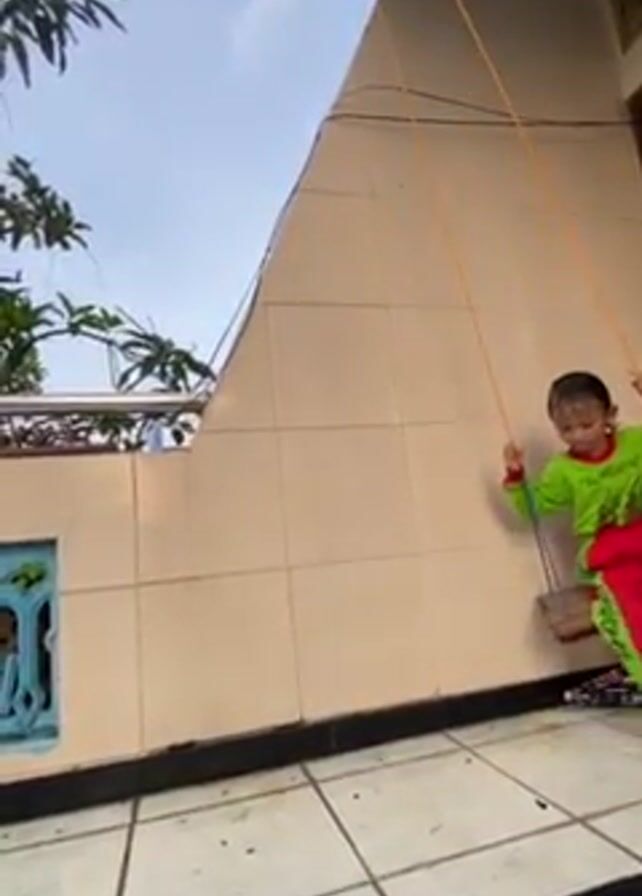 A young girl in a green and red outfit is on a homemade wooden swing, suspended by yellow ropes. She is standing on the swing seat, holding the ropes, and pushing herself back and forth. The swing is attached to the eaves of a light-colored building with a tiled exterior. A small blue decorative window is visible on the side of the building. A tree with green leaves is partially visible in the upper left corner. The ground is tiled and a black rug is in the foreground. The sky is overcast. The girl briefly sits, then stands again, pumping her legs to swing higher.