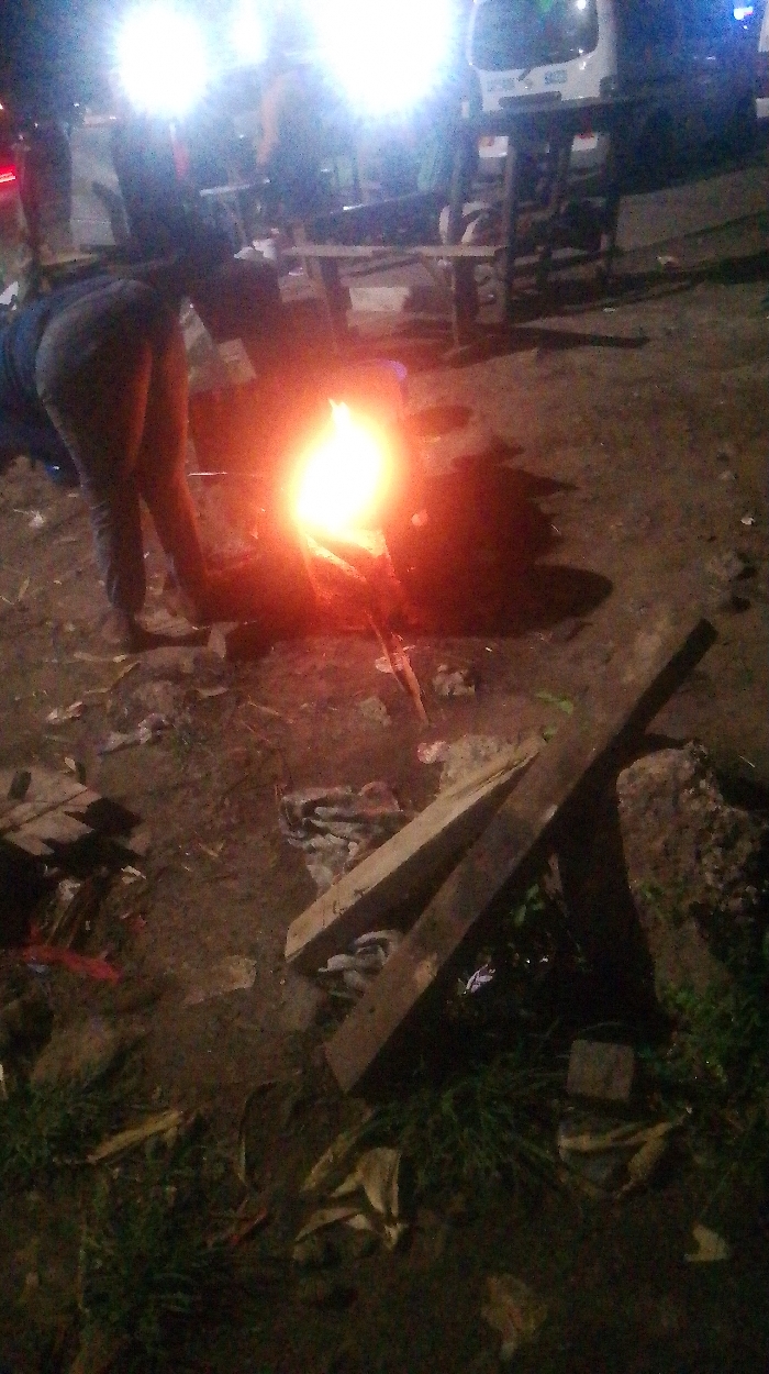 A nighttime scene shows a fire with a bright flame. A person in light-colored shorts bends over the fire. Behind them, illuminated by bright lights, is a white van and various structures. The foreground consists of dark earth with scattered debris, including pieces of wood, paper, and some grass.