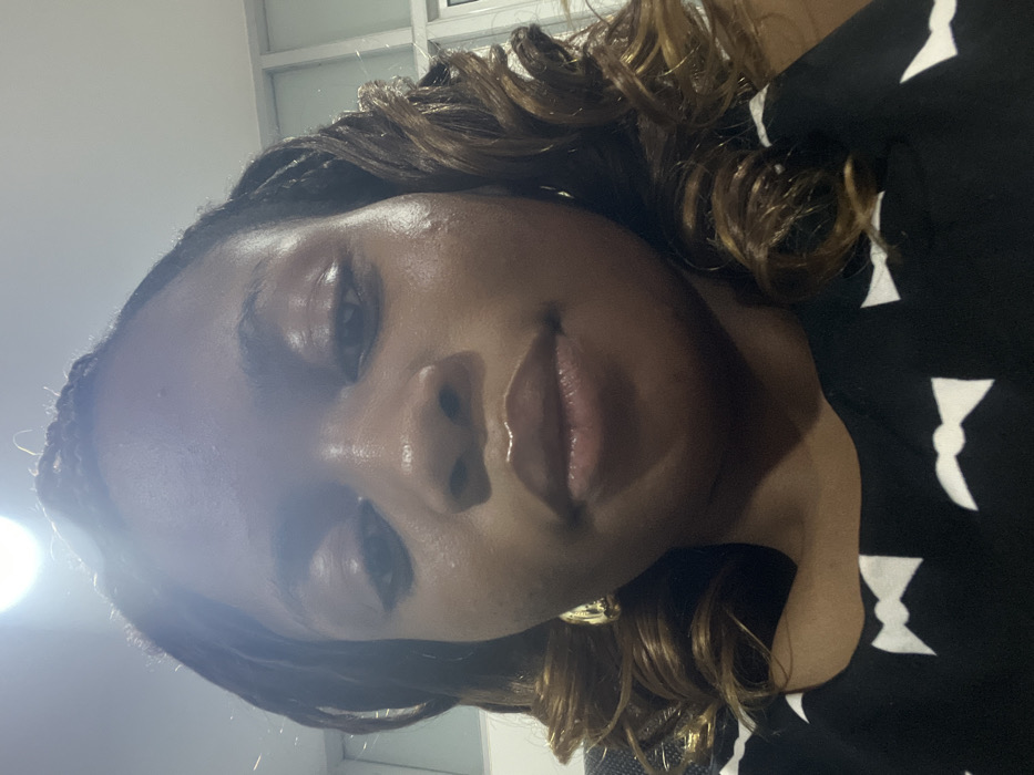 The image displays a close-up, head-and-shoulders portrait of a single adult female in an indoor setting. Her face is centered and occupies the majority of the frame, angled slightly upward towards the camera. She has dark skin, full, glossy lips, and dark eyes. Her hair is dark brown with lighter highlights, styled with braids visible on the viewer's left side of her head and loose, wavy curls on the right. She wears a black garment featuring a repeating pattern of white bow ties on the visible chest and shoulder areas. A gold-toned earring is partially visible on her left earlobe. The background is indistinct, characterized by light-colored, possibly white or light grey, wall or partition surfaces. A prominent overhead light source creates a bright reflection on her forehead and the top of her head, indicating artificial illumination. The specific location within Ikeja, Nigeria, is not discernible from the visual information provided. No actions or interactions with other subjects are depicted.