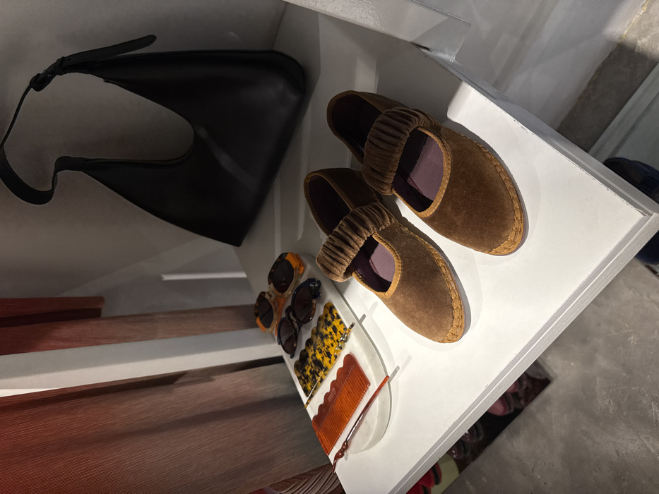 A black bag with a strap rests inside a white shelf. Next to it are two brown velvet shoes, each with a purple insole and a brown band across the top. Nearby is a white tray holding four pairs of sunglasses in various colors, a leopard-print hair clip, a brown comb, and a red hairpin. The shelf appears to be at an angle.