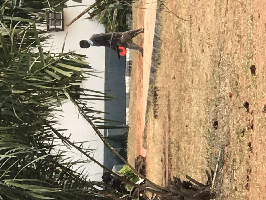 The scene is an outdoor environment in the city of Okura, Nigeria. A male individual with dark skin, wearing dark clothing and a light-colored neck covering, walks from left to right on a paved pathway. He carries an object in his right hand, which appears to be a dark-colored weapon fitted with a prominent red, circular drum magazine. The foreground is partially obscured by the fronds of a palm tree. The ground consists of dry, sparse yellowish-brown grass and reddish-brown earth. In the background, a white building with a dark gray lower section and a barred window is visible.