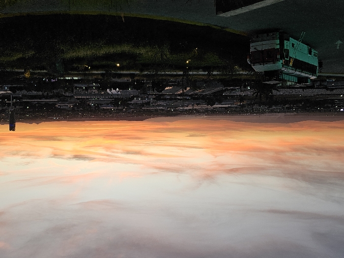 A vibrant sunset paints the sky with hues of orange and pink. Below, the city lights twinkle, reflecting the sky's colors. The silhouette of distant mountains adds depth. A green train rests on tracks along a grassy embankment. The image is presented upside down, creating an unusual perspective of the scene.