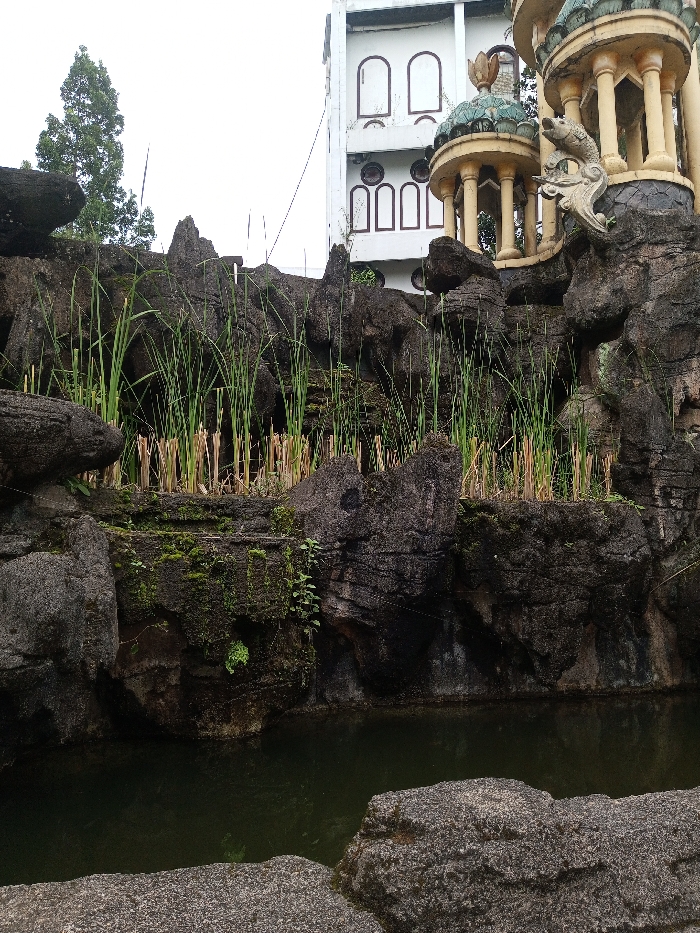 A tiered rock formation with reeds growing on the middle level sits in front of a murky pool. Moss and small plants cling to the rocks. Above, a white building with arched windows is partially visible, along with ornate, pillared structures topped with decorative domes and a fish sculpture. A tall tree appears to the left of the building. The scene is overcast.