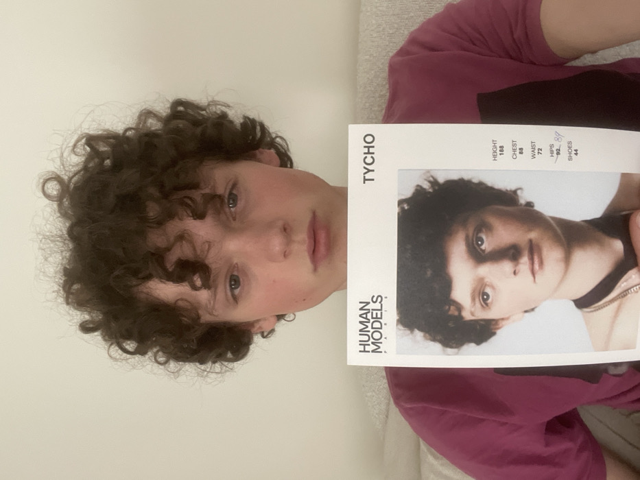 A young male with dark brown curly hair and light eyes is centered in the frame, holding a white modeling comp card in front of his torso
