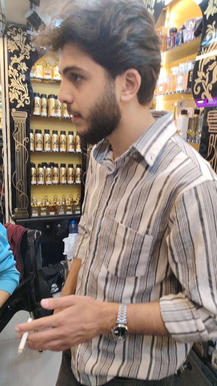 An indoor scene in what appears to be a fragrance or perfume shop, located in Barza Municipality, Syria
