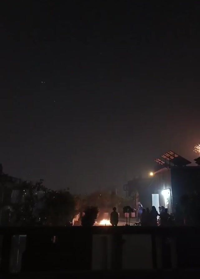 At night, a group of people are gathered around a bonfire in a residential area, and fireworks are being launched into the dark sky. The scene is dark, with the fire providing the main source of light, illuminating the people and their silhouettes. The buildings in the background are shadowy. There are some trees nearby. The sky is almost completely dark.