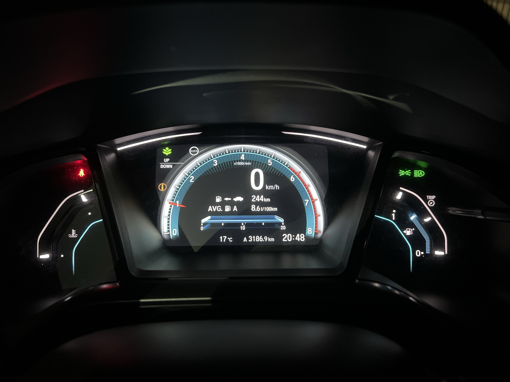A close-up photograph shows the illuminated digital instrument cluster of a car