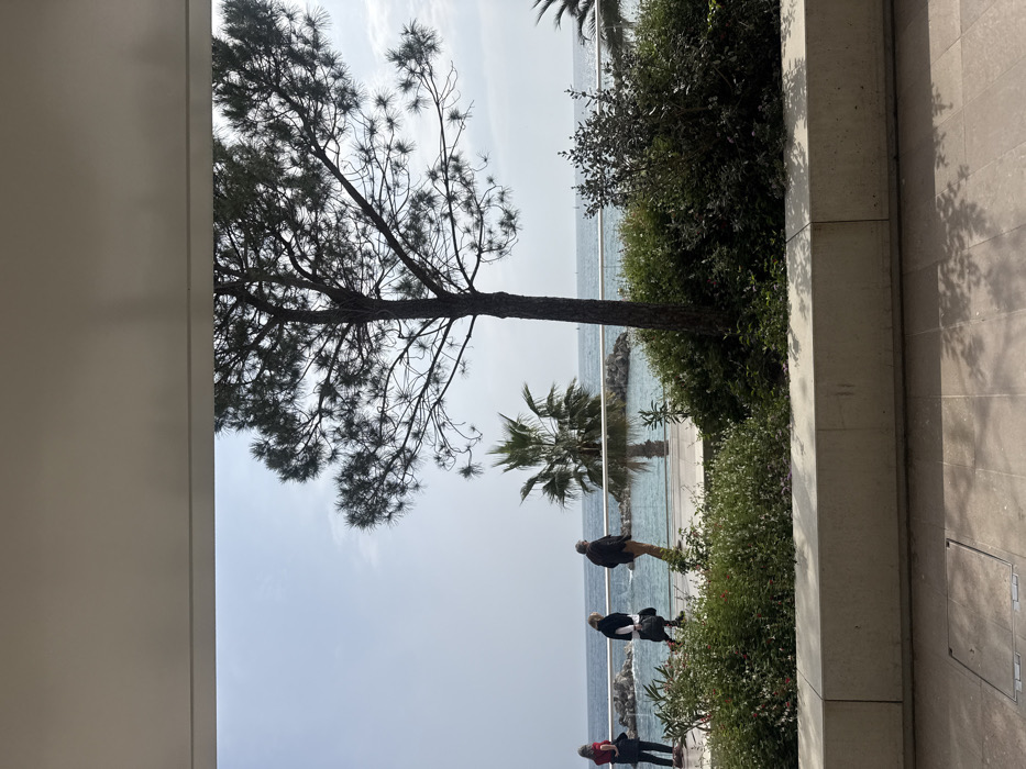 The image portrays an outdoor coastal scene from a partially shaded vantage point, likely a promenade in Monaco, Monaco, possibly near Port Hercule or Larvotto Beach. In the immediate foreground, a light-colored tiled walkway is visible, interspersed with shadows. This leads to a low, light-colored concrete planter or bench structure, behind which dense green foliage, including bushes and smaller plants, thrives. A prominent pine-like tree with a dark trunk and extensive branches dominates the mid-ground, positioned slightly to the right of center. Behind the tree and foliage, a wide, light-colored pedestrian promenade runs horizontally, bordered by a simple metal railing. Three individuals are observed walking along this promenade from left to right. The leftmost person wears a red top and dark pants, standing with their back mostly to the viewer. The central figure wears a dark coat over a lighter garment and carries a dark bag. The rightmost individual wears a dark jacket and light-colored trousers. Beyond the promenade and railing, the clear, turquoise-blue water of the Mediterranean Sea extends to the horizon. Artificial rock breakwaters are visible within the water, particularly towards the left. A large palm tree stands prominently behind the railing, appearing to be on a small extension or island in the sea. A second palm tree is partially visible on the far right. The sky overhead is a pale blue with minimal cloud cover. A light-colored architectural overhang or ceiling structure partially frames the top portion of the image, indicating the perspective is from underneath a building or awning.