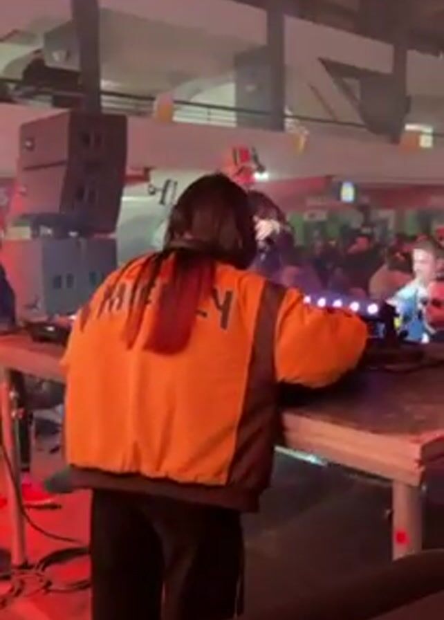 The video captures the atmosphere of a lively event, possibly a concert or party, with music playing in the background. The primary focus is on two individuals: a DJ and a man in the crowd. The DJ, wearing a distinctive yellow and black jacket with "Hustle" written on the back, stands behind a DJ booth, likely mixing music. In the crowd, a man wearing sunglasses, a cap, and a black puffer jacket raises his middle finger while holding a drink. The environment is a large, open space with visible beams and overhead structures, suggesting a warehouse-type venue. The crowd is dense and energetic, with people moving and enjoying the music. Red lighting and smoke effects enhance the party atmosphere.