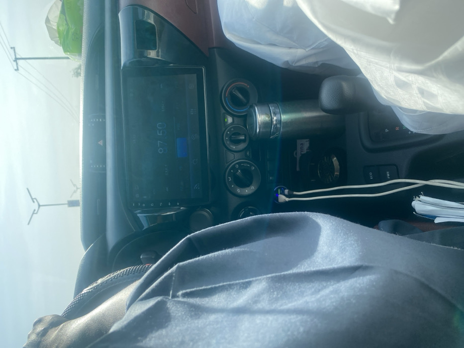 interior of a vehicle. A dashboard with a display screen showing '87.50' is in view. Climate control dials and a gear shift are also visible. Two charging cables are plugged into a USB adapter. A white garment is draped in the upper-right, while grey material obscures the bottom portion. Outside, utility poles are visible through the windshield.