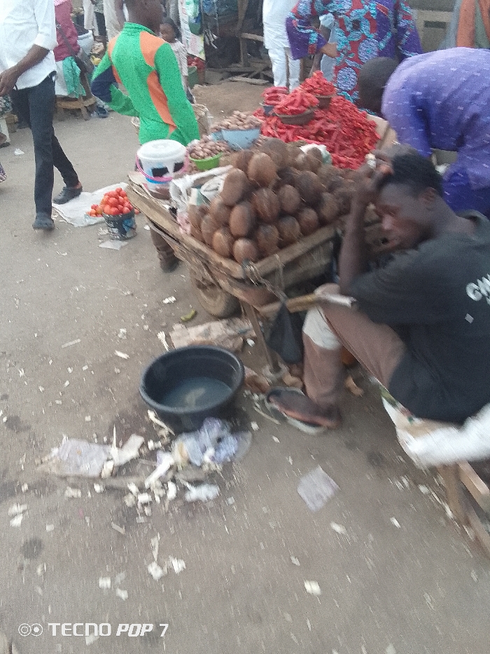 A man sits beside a wooden cart laden with coconuts, red peppers, onions, and tomatoes. The scene is a busy street market with other people milling about. A black bucket containing water rests on the ground, surrounded by debris and refuse. The man appears weary, resting his head in his hands. The overall impression is one of urban commerce with a focus on the man selling his wares in the crowded marketplace.