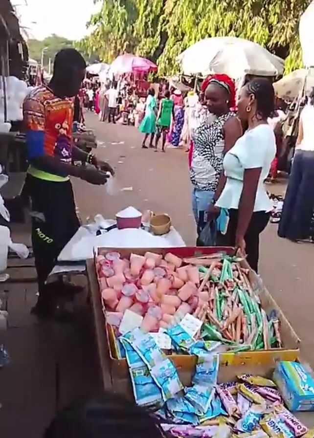The scene takes place in a bustling outdoor market. A vendor wearing a colorful, patterned shirt and dark shorts stands behind a makeshift table laden with various items, primarily snacks. He is preparing a small plastic bag with something, possibly a topping, from a container on the table. Two women stand on the customer side, engaged in conversation, seemingly waiting to be served. The table displays neatly arranged rows of small, cup-shaped desserts, likely yogurt or ice cream, along with an assortment of packaged snacks, including chocolate bars and other treats. A young girl with braided hair, wearing a pink shirt and jeans, is looking at the table. The market is filled with people walking around, and there are umbrellas and makeshift stalls visible in the background. The area is partly shaded by trees.