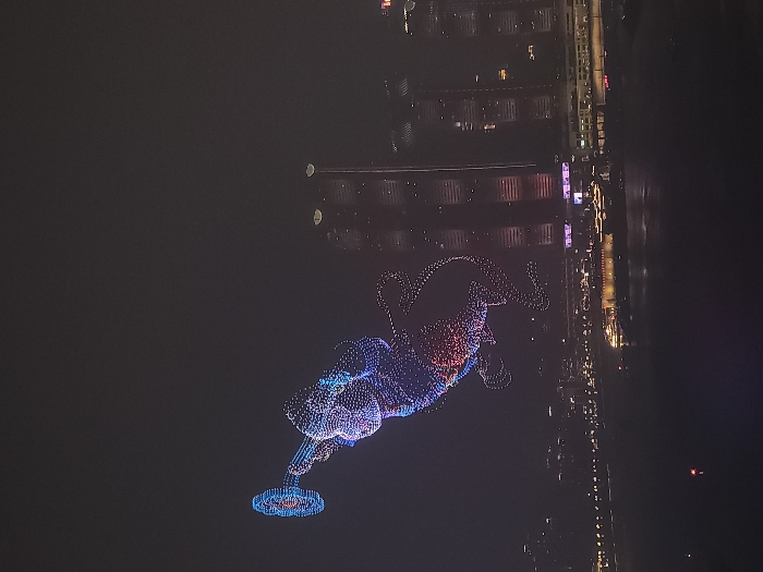 - "The image displays a nighttime scene in 江北城街道, China, featuring an aerial drone light show above a river and an illuminated urban skyline" by FM-intJc2, licensed under CC BY 4.0