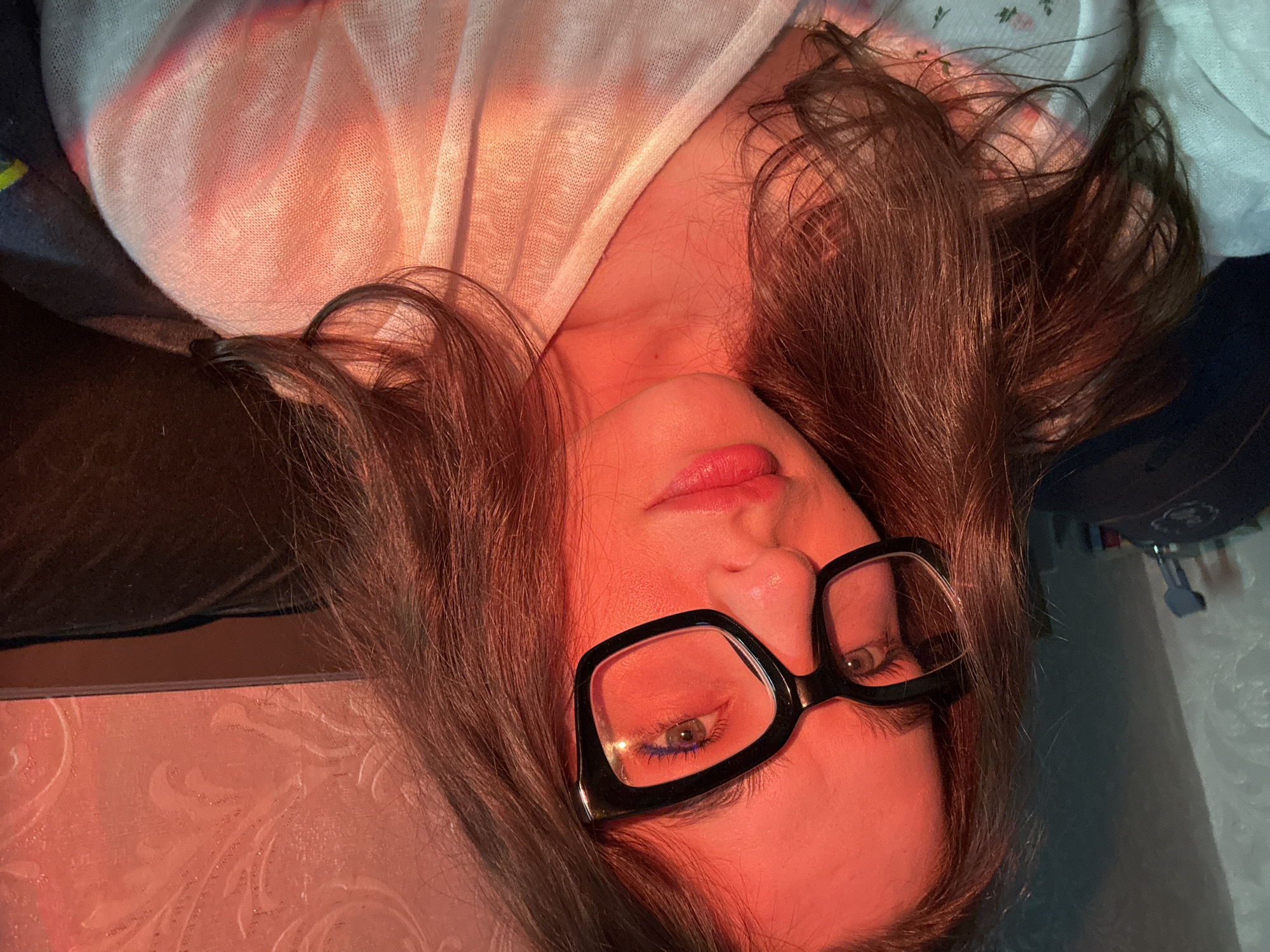 A woman lies on her side, face up, wearing glasses with black frames. She has long, brown hair. Her lips are slightly parted. She is wearing a light-colored, possibly white or light pink, patterned top. The room is illuminated with a red light source, which casts a reddish hue over the scene. The background appears to have textured wallpaper, and glimpses of a blueish area can be seen, suggesting other elements in the room. The scene appears to be indoors. There is no information about the location in the city of Chaikovsky, Russia.
