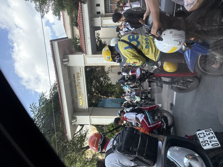 - "The image depicts a crowded street scene outside the main entrance of Nguyễn Hữu Thọ High School (Trường THPT Nguyễn Hữu Thọ) in Thủ Đức, Ho Chi Minh City, Vietnam, during daylight hours under a partially cloudy sky" by FM-evvBH2, licensed under CC BY 4.0