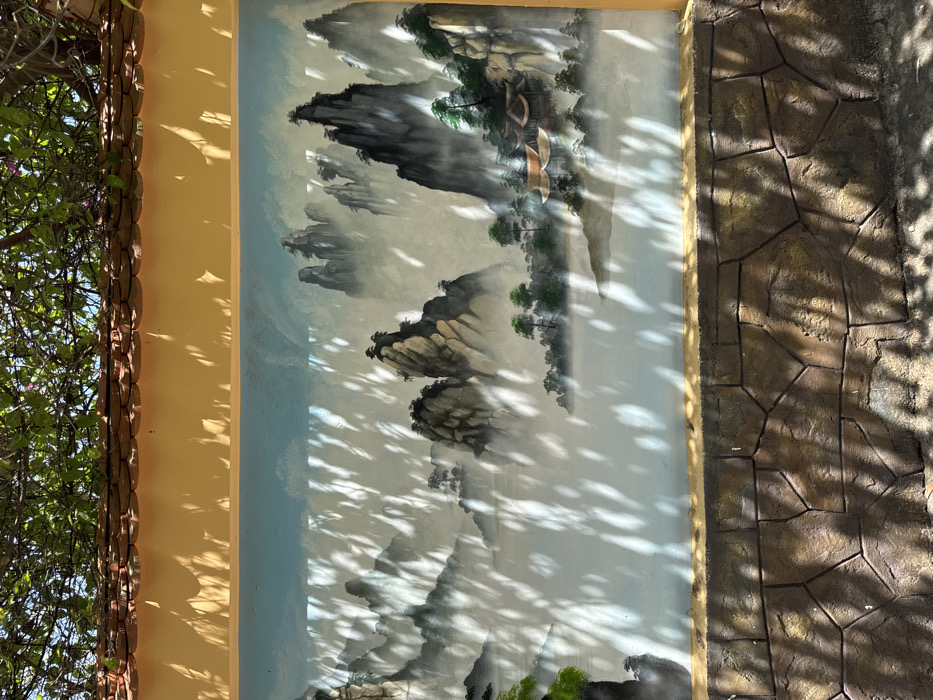 A painting of a Chinese landscape depicting mountains and trees is bordered by a yellow wall with leafy foliage on one side and a textured brown wall on the other
