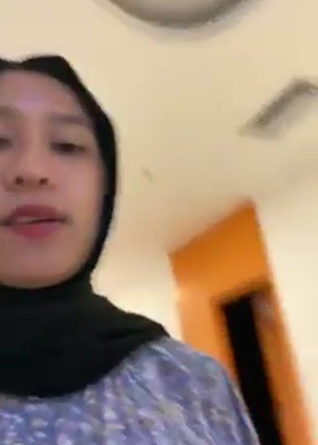 A person wearing a black hijab and a floral patterned top is walking down a well-lit hallway