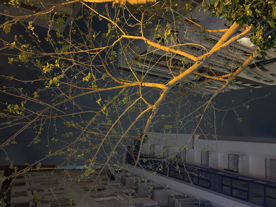 The image captures an upward-angled view of an urban environment at night in Tanger, Morocco. A prominent deciduous tree, illuminated by a warm yellow-orange artificial light, occupies the foreground and midground, displaying a network of bare branches interspersed with sparse clusters of nascent light green leaves. In the background on the left, a tall, modern, light-colored building with multiple levels, dark-framed windows, and tiered balconies with dark railings extends vertically. A second, similar tall building is partially visible on the far right, obscured by the tree's foliage and branches. The sky above is dark, indicating nighttime conditions. No individuals, overt actions, or direct interactions are visible.