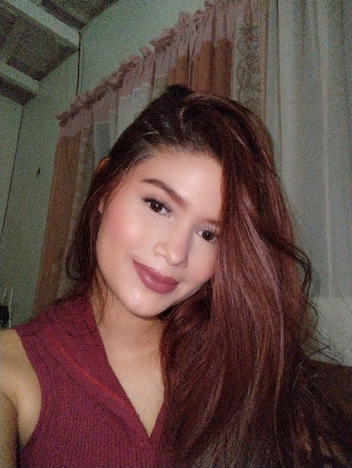 A young woman with long, reddish-brown hair smiles softly at the camera. She wears a sleeveless, maroon top with a textured knit pattern. Her makeup is subtle, featuring defined eyebrows, eyeshadow, and a mauve lip color. The background includes a partially visible window with light-colored curtains and decorative valances. The lighting is soft and diffuse, creating a warm and inviting atmosphere.