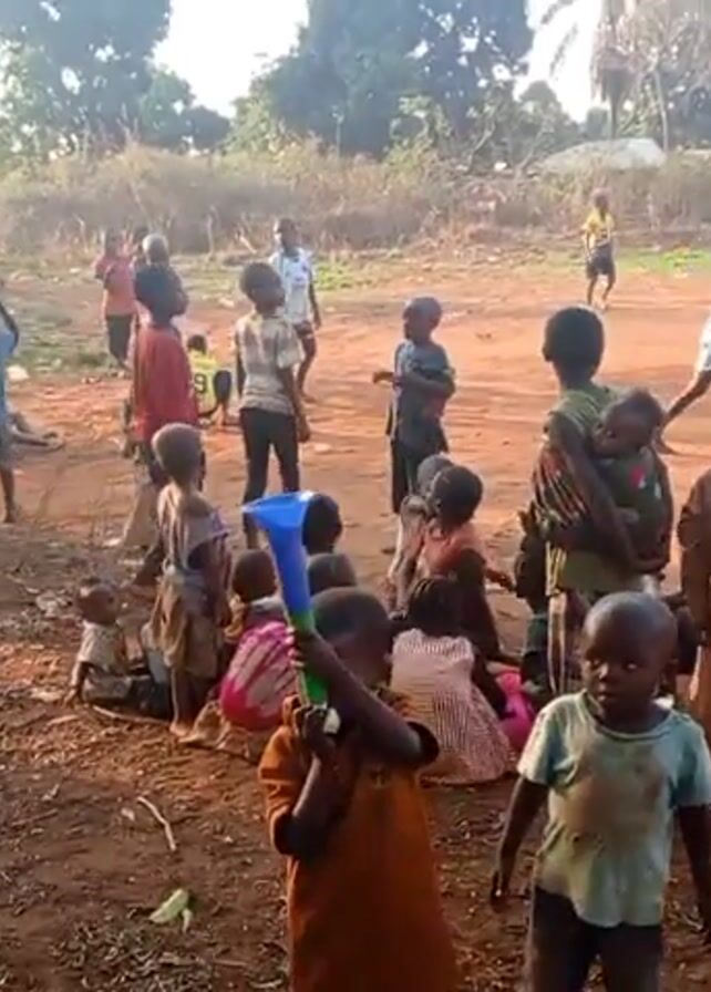 A large group of children, many barefoot, are gathered on a dirt field. Some are playing, others are walking, and several are standing or sitting in a cluster. A child in an orange garment is holding up a blue and green plastic horn and blowing into it. The background includes trees, shrubs, and buildings, and some people are visible in the distance on a field, possibly playing a game. The sky appears clear and bright.