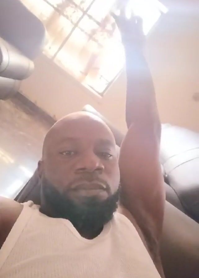 A person with dark skin, a shaved head, and a beard, wearing a white tank top, is sitting and holding up a hand, making a hand gesture resembling a "peace sign" or a "V" for victory