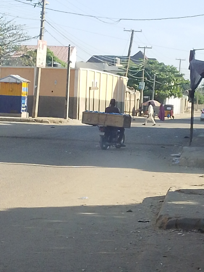 A motorcyclist balances a large box on their head while riding down a sunlit street. The box appears to contain goods wrapped in blue material. Pedestrians and a motorized tricycle are visible in the background. Buildings line the street with electrical poles and wires overhead. A small blue and yellow structure sits on the corner. The road shows signs of wear and debris.