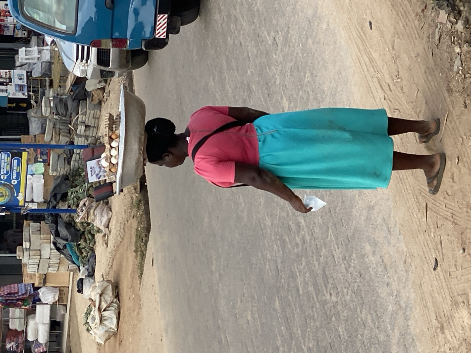 - "In Ablekuma, Ghana, a dark-skinned woman stands with her back to the observer, positioned on a paved road surface adjacent to a dirt shoulder" by FM-IRJUp1, licensed under CC BY 4.0