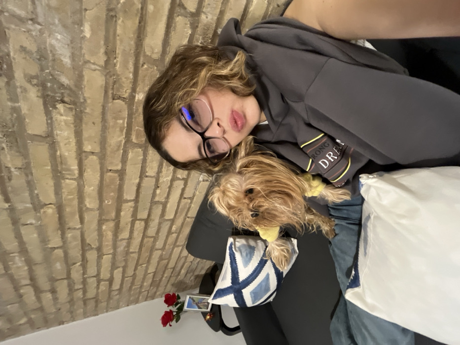 The image depicts an indoor residential setting. A young adult female with shoulder-length wavy light brown hair and wearing clear-framed glasses is positioned for a selfie. She wears a dark grey hooded sweatshirt with a partially visible graphic containing text ("STRONG DR[...] DREAM") and blue jeans. A small Yorkshire Terrier-type dog with long, light brown fur and wearing a yellow garment is situated on her left side, partially on her lap. Her lips are slightly pursed. To the left of the female, a dark grey sofa is visible, on which a decorative pillow with a blue and white geometric pattern rests. Adjacent to the sofa is a small, round, black side table. On this table are a vase containing two red artificial roses, a small framed photograph, and a dark decorative object. A large white pillow or cushion occupies the lower foreground. The background features an exposed brick wall composed of light brown bricks with dark mortar lines. No specific identifiers for a location within the city of Valencia, Spain, are discernable within the image.