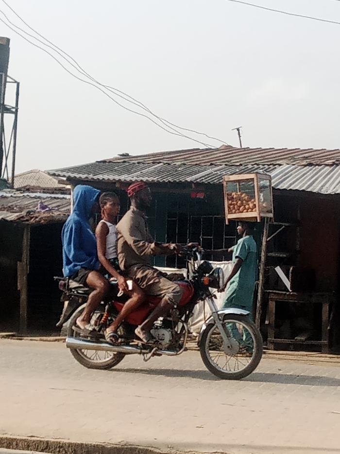 - "In Ikorodu, Nigeria, a red motorcycle travels leftward on a paved road, carrying three individuals" by FM-7Np923, licensed under CC BY 4.0