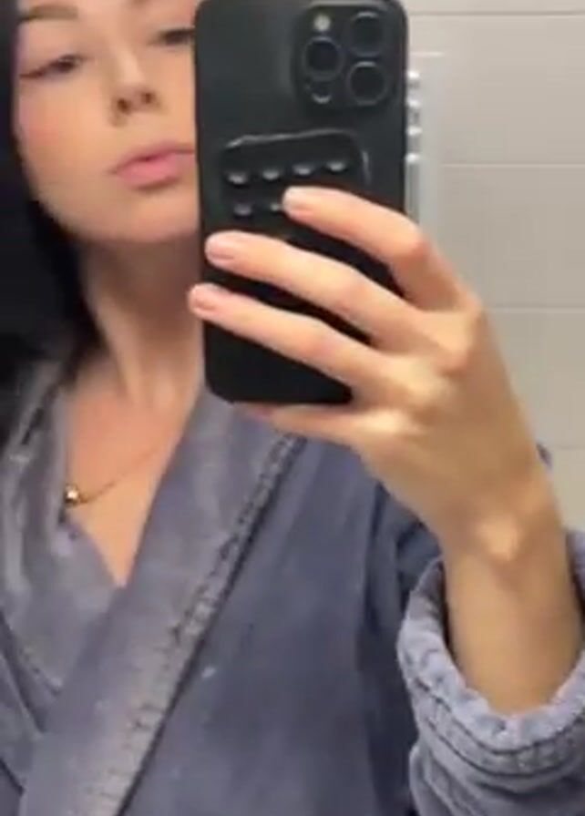 A woman with dark hair, wearing a gray robe and a gold necklace, is standing in front of a mirror
