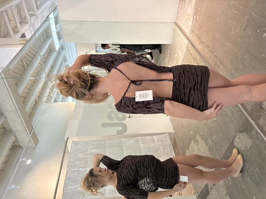 A fair-skinned individual, likely female, with blonde hair styled in a messy bun, is depicted from behind, viewing her reflection in a large mirror within a retail clothing store in West Hollywood, United States of America. She is wearing a short-sleeved, dark brown mini-dress with a subtle animal print, featuring an open back with a criss-cross tie. A white price tag hangs from the back tie, and another is visible on the lower portion of the dress in her reflection. Her right hand is raised, touching or adjusting her hair. In the reflection, she is seen facing forward, slightly angled, wearing light beige ballet flats. The retail environment includes a scuffed concrete floor, white walls, and an exposed ceiling with white beams, pipes, and track lighting fixtures. A translucent white plastic curtain is visible behind her reflection, along with the partial word "Ja..." rendered in large, light-grey letters on a white wall. A male figure in dark clothing is faintly visible in the background of the mirror's reflection.