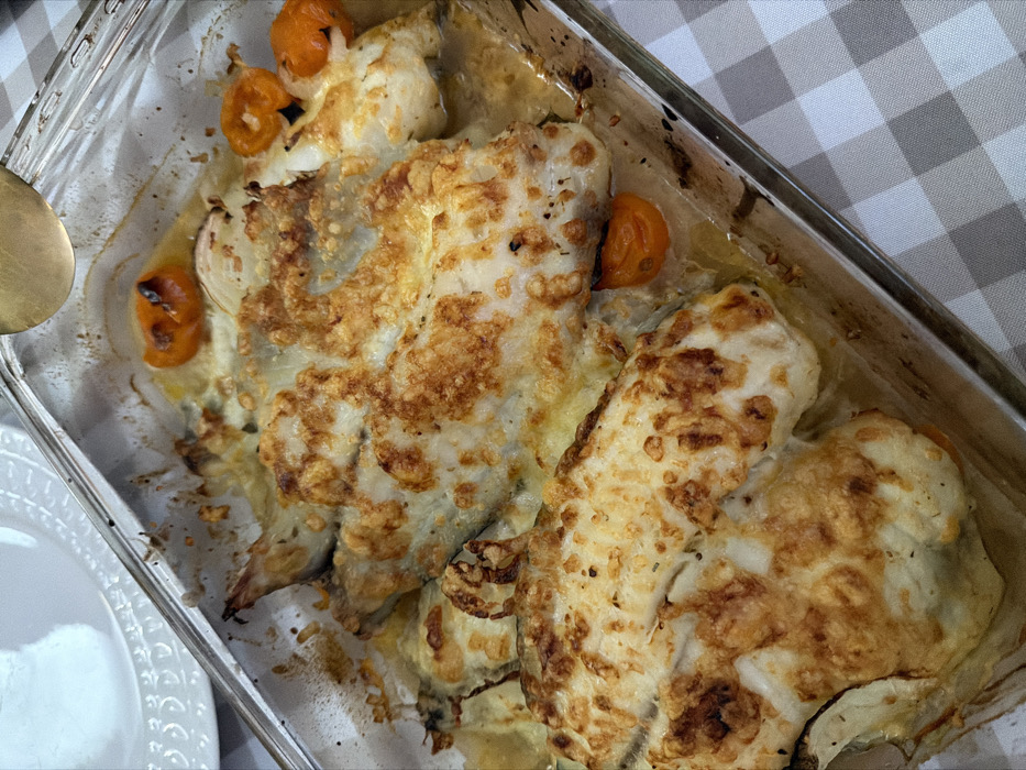 A rectangular glass baking dish containing baked fish fillets is positioned on a table in Nahariyya, Israel