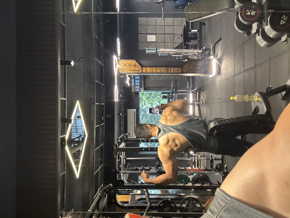 A muscular man in a gym setting, taking a selfie