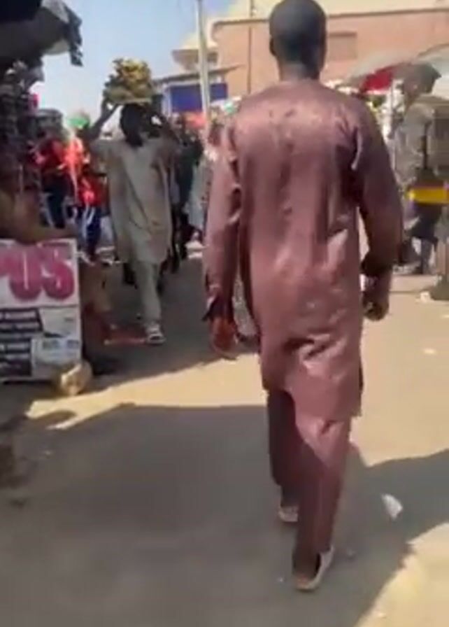 The video depicts a street scene in what appears to be a busy market or commercial area. The camera follows a man wearing a brown, traditional-style outfit as he walks down a paved street. Other people are present, including a man balancing a tray of goods on his head, individuals in casual and traditional clothing, and merchants or vendors under umbrellas. The ground is littered with small pieces of debris. The lighting suggests a sunny day, and the overall environment seems crowded and bustling. Buildings and signs are visible in the background.