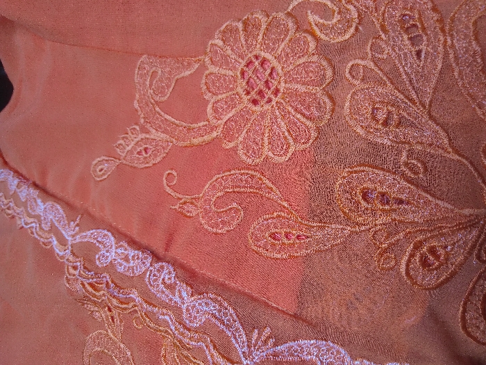 A close-up image displays an embellished textile, primarily in a light orange or peach hue. The fabric features intricate embroidery. On the left, a distinct diagonal band of white embroidery presents curvilinear, scroll-like, and floral motifs. To the right, a complex pattern of tone-on-tone embroidery in shades of peach, orange, and gold includes a prominent multi-petaled floral design with a textured center, alongside various stylized leaf and paisley-like elements. Some embroidered areas show a subtle sheen and small perforations or openwork details. The base fabric appears sheer with a fine texture. No people, objects other than the fabric, or environmental details are discernible. The image provides no visual information to establish a location in the city of Pokhara, Nepal, or any other specific geographical context.