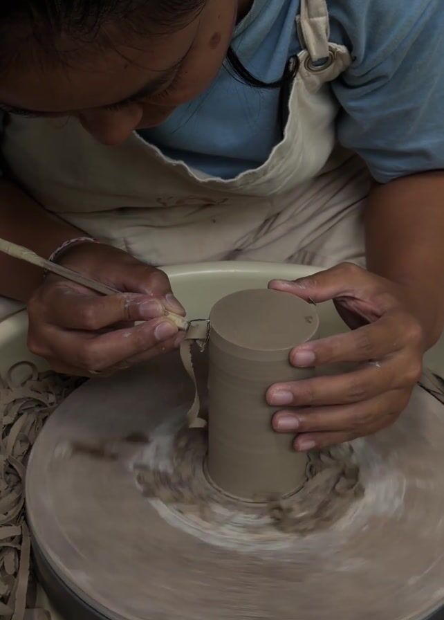 A person is shown using a pottery wheel to shape a cylindrical piece of clay