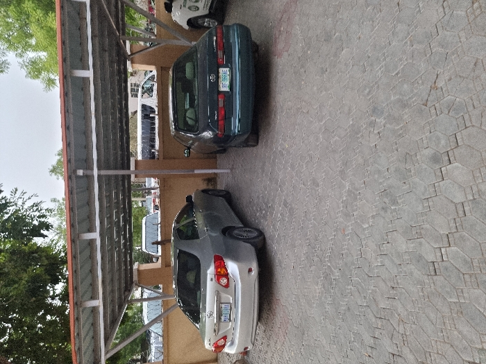 two cars parked under a metal carport in Maiduguri, Nigeria. The carport is supported by four metal posts. The car on the left is a silver Toyota Corolla. The car on the right is a dark green Toyota Camry. The cars are parked on a paved surface, with concrete block pavers laid in a repeating pattern. The background consists of a low, tan wall, a few trees, and other vehicles parked in the distance. The scene appears to be a residential or commercial parking lot.