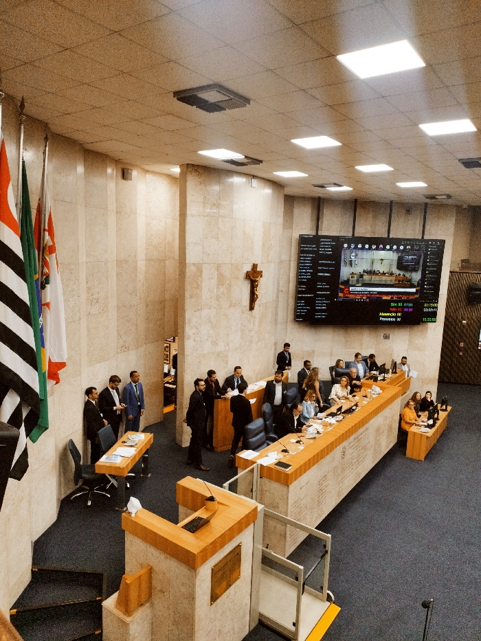 An eye-level shot captures a room with various officials. Some wear suits while gathered around desks and podiums, while others sit at a long desk facing forward. A large screen displays a live video feed of the room. Flags adorn the left side, and a cross is mounted on the wall. The setting appears to be a legislative or governmental assembly hall.