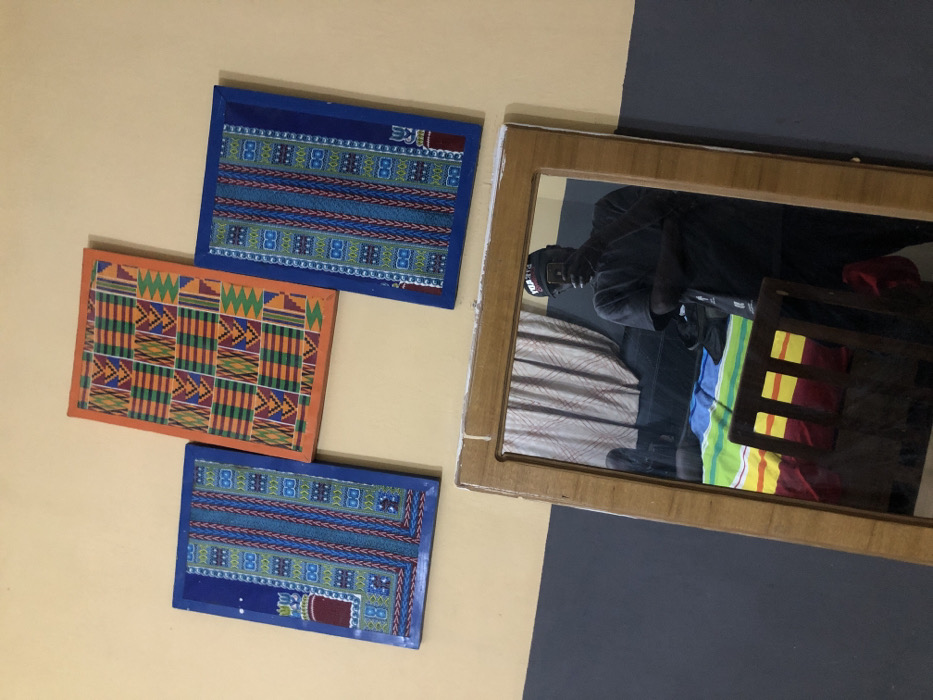 Three framed textile art pieces hang on a pale yellow wall. Two have blue frames and similar geometric patterns. One is framed in orange, displaying a grid of colorful squares. Adjacent, a wooden-framed mirror reflects a person, a bed with striped linens, and a chair with yellow and red accents. The wall is divided horizontally, with a dark gray area on the right.
