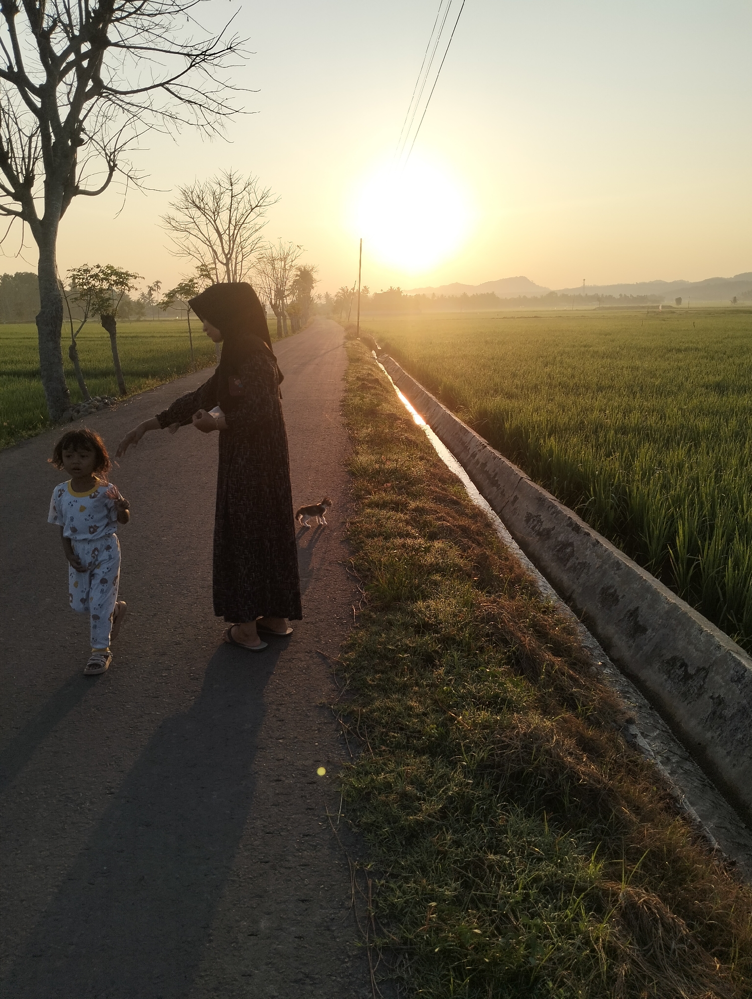 - "An adult female and a young child are observed walking on an asphalt road in Meunasahalue, Indonesia, under a low-lying sun suggesting either sunrise or sunset" by FM-sAcf03, licensed under CC BY 4.0