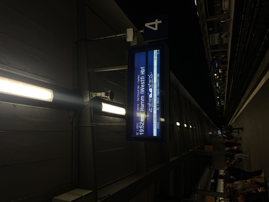 This image depicts a low-light scene on Platform 4 of Essen Hauptbahnhof (Essen Hbf) in Essen, Germany