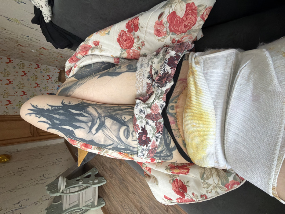 The image displays a first-person perspective of an individual's lower torso and legs within an indoor residential setting in Chaikovsky, Russia. The individual is reclined on a dark gray upholstered surface, with a white, red, and green floral-patterned blanket partially covering their right leg and the surface. The lower abdomen presents a horizontal surgical incision, approximately 15-20 cm in length, with visible sutures, indicating a recent medical procedure. Below this incision, a white, absorbent bandage or compression garment is wrapped around the abdominal area, featuring a prominent, central yellow stain, approximately 10x20 cm. A black undergarment and a white floral-patterned garment with lace trim are partially visible around the upper thighs. Both legs are extensively adorned with black ink tattoos, including a detailed stylized face or figure on the right thigh. The background on the left features a light-colored wooden floor, a light green wooden children's slide or play structure with decorative cut-outs, and wallpaper with a subtle vine pattern. On the right, the wall is covered with wallpaper depicting a repeating pattern of small orange foxes and trees on a white background. A dark piece of fabric is draped over the sofa on the right, and a partially deflated gold balloon hangs near the ceiling in the upper left background. The scene suggests a period of rest or recovery following surgery.
