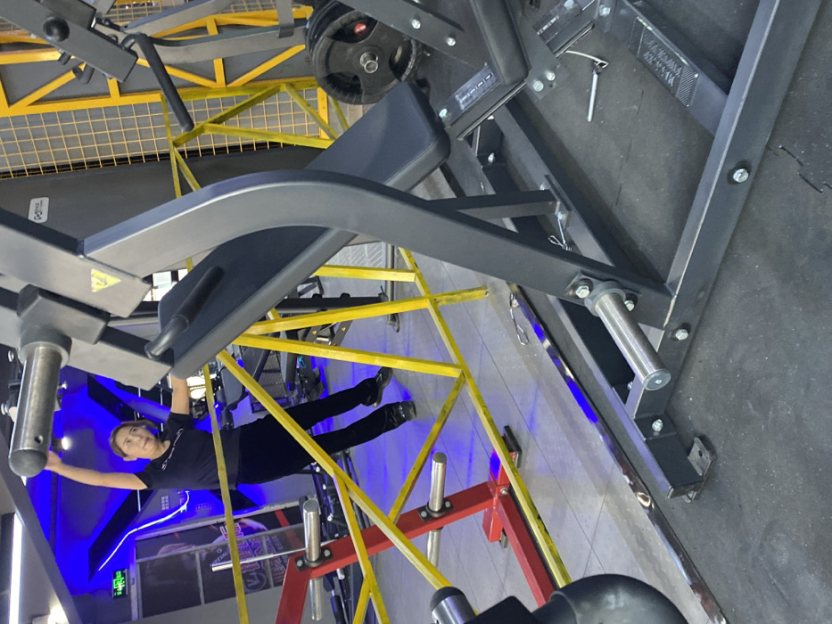 A person in black clothing is seen hanging horizontally from a yellow and red metal structure within a gym. The gym also contains weightlifting equipment, including machines with black frames. The flooring is a mix of tile and rubber, with blue lighting emphasizing some areas. The ceiling has an open, grid-like design.