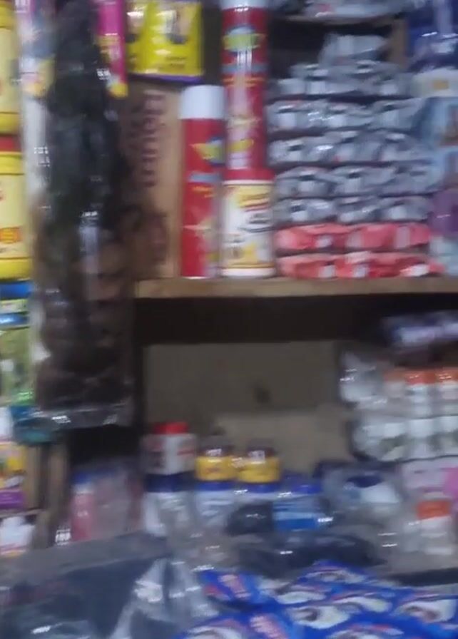 The camera pans upwards inside a small general store or convenience shop, showcasing shelves packed with various goods