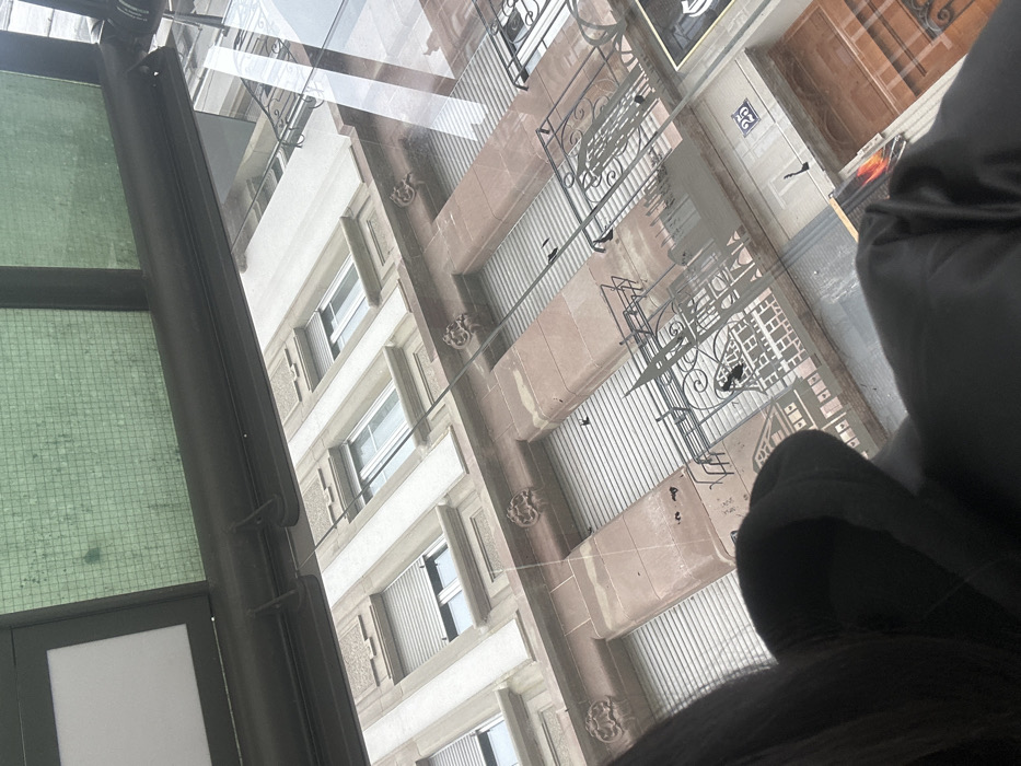 The image provides an angled, downward view across a street toward a multi-story building facade in Strasbourg, France, observed through a glass surface that exhibits reflections. In the immediate foreground, the back of a person's head and a shoulder, clad in a dark hooded garment, are partially visible on the left and bottom. Above this, a dark metal frame supports a section of a green, grid-patterned glass or tiled ceiling. The glass through which the scene is viewed reflects a prominent, stylized silhouette of a cityscape. The primary subject is the building facade, which features reddish-brown stone on its lower levels, consistent with local architecture. These levels present multiple windows, each equipped with fully closed, light-colored roll-down shutters. Above some of these windows, decorative stone carvings, possibly grotesque faces or masks, are visible. Wrought-iron balconies with intricate, curvilinear designs protrude from these lower levels. A ground-level entrance features a visible address number "25" on the doorframe. The upper stories of the building are constructed with a lighter, possibly white or cream-colored, material. Windows on these upper floors are visible, some partially open, others with partially raised or closed shutters. The lighting is diffused, indicating an overcast day. No other people or moving objects are discernible.